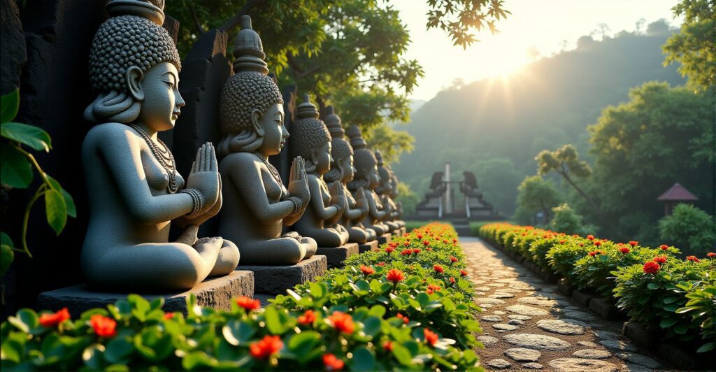 Elementen uit de natuur – bergen, rivieren, wolken – hebben allemaal hun eigen betekenis. Bergen staan voor kracht, rivieren voor zuivering, wolken voor verbinding. Het Hindoeïsme zie je overal terug, met goden, mythische figuren en heilige tekens die vaak in de motieven verwerkt zijn.