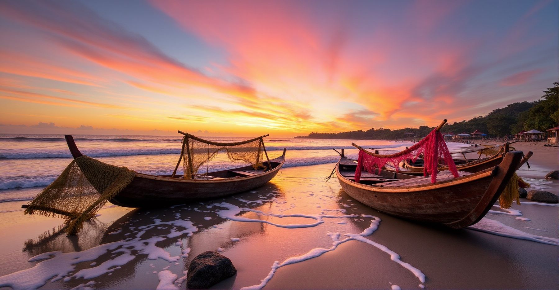 Op Kedonganan Beach zie je de zon langzaam verdwijnen in de Indische Oceaan. Het licht wordt zacht, de lucht kleurt oranje en roze. Je kiest zelf waar je wilt zitten: bij de seafood restaurants op het centrale strand, tussen de vissersboten, of wat rustiger aan het noordelijke uiteinde bij de pier. Dat is trouwens een fijne plek voor foto’s. Het zuidelijke deel voorbij de vismarkt is vooral populair bij locals, en achter de vissersdorpjes vind je rustige inhammen. Vanaf de pier zie je soms vliegtuigen landen. De vissersboten zorgen voor mooie silhouetten tegen de oranje lucht. Het mooiste licht is er tussen 17:45 en 18:30, vooral in het droge seizoen als de lucht helder is. Bij laagwater wordt het strand breder en zie je de lucht weerspiegeld in het natte zand. Bij hoogwater komen de golven tot aan de restaurants. Voor fotografen zijn er kansen voor reflecties en silhouetten, en een polarisatiefilter maakt de kleuren dieper.