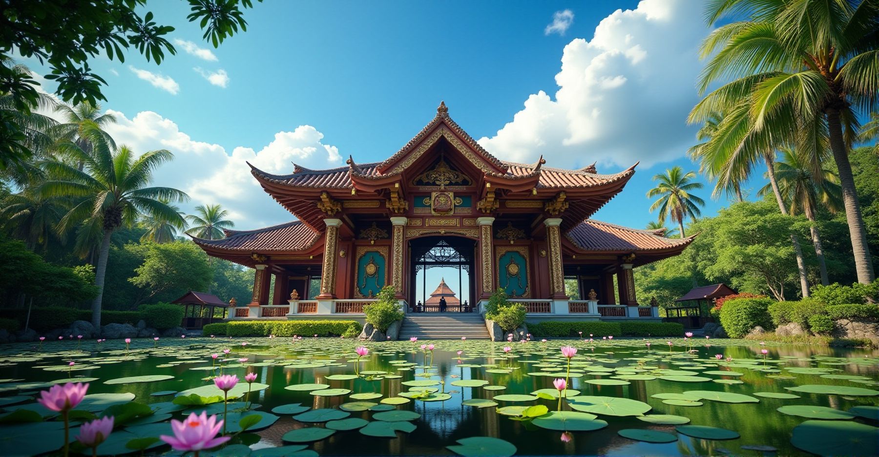 Een opvallend onderdeel is de Bale Kambang, een apart paviljoen dat lijkt te drijven op zijn eigen vijver. Hier konden mensen in alle rust nadenken of belangrijke gesprekken voeren, weg van de drukte. De poorten zijn versierd met gouden details, zodat je meteen ziet dat dit een koninklijke plek is.