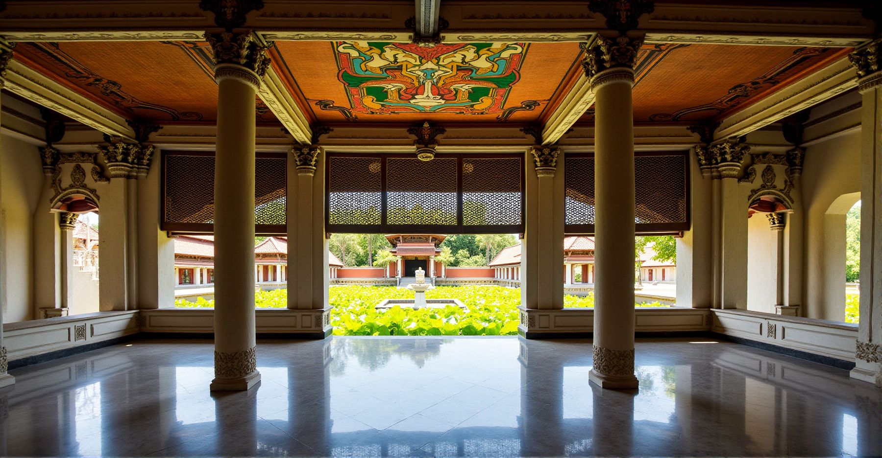 De gebouwen zijn open opgezet, waardoor er altijd een lekker briesje doorheen waait. Dat zorgt voor verkoeling, zelfs op warme dagen. Op het plafond zie je schilderingen die niet alleen mooi zijn, maar ook verhalen vertellen die bezoekers nog steeds aanspreken.