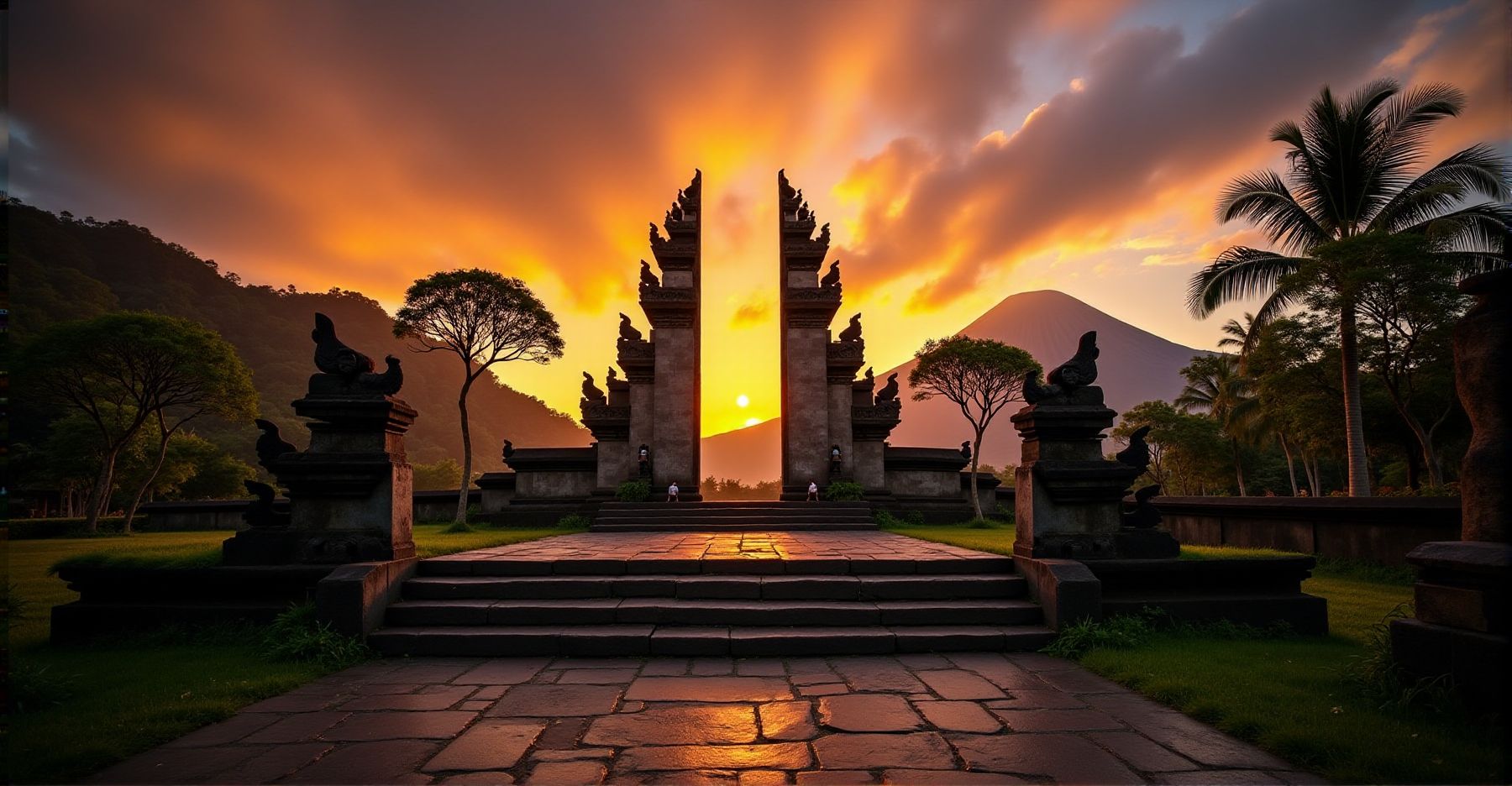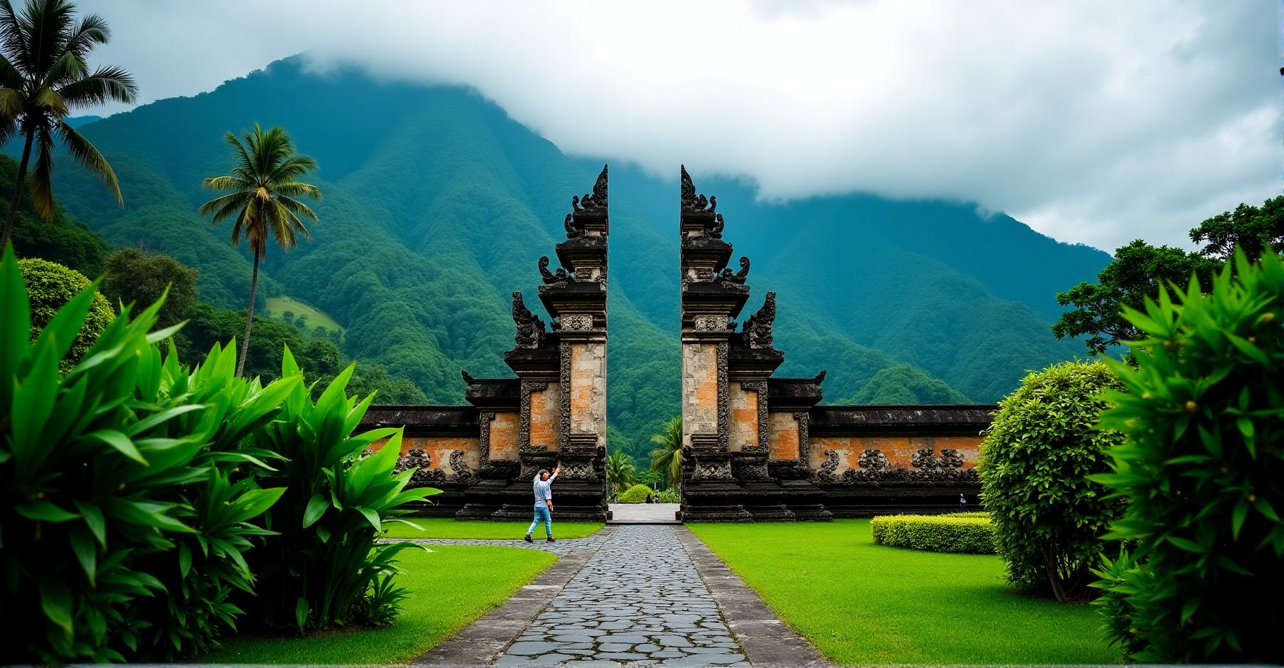 De Candi Bentar bij Lempuyang is een opvallende gespleten poort met rijke versieringen. De poort bestaat uit twee helften met houtsnijwerk en stenen details van mythische figuren, bloemen en beschermende symbolen.