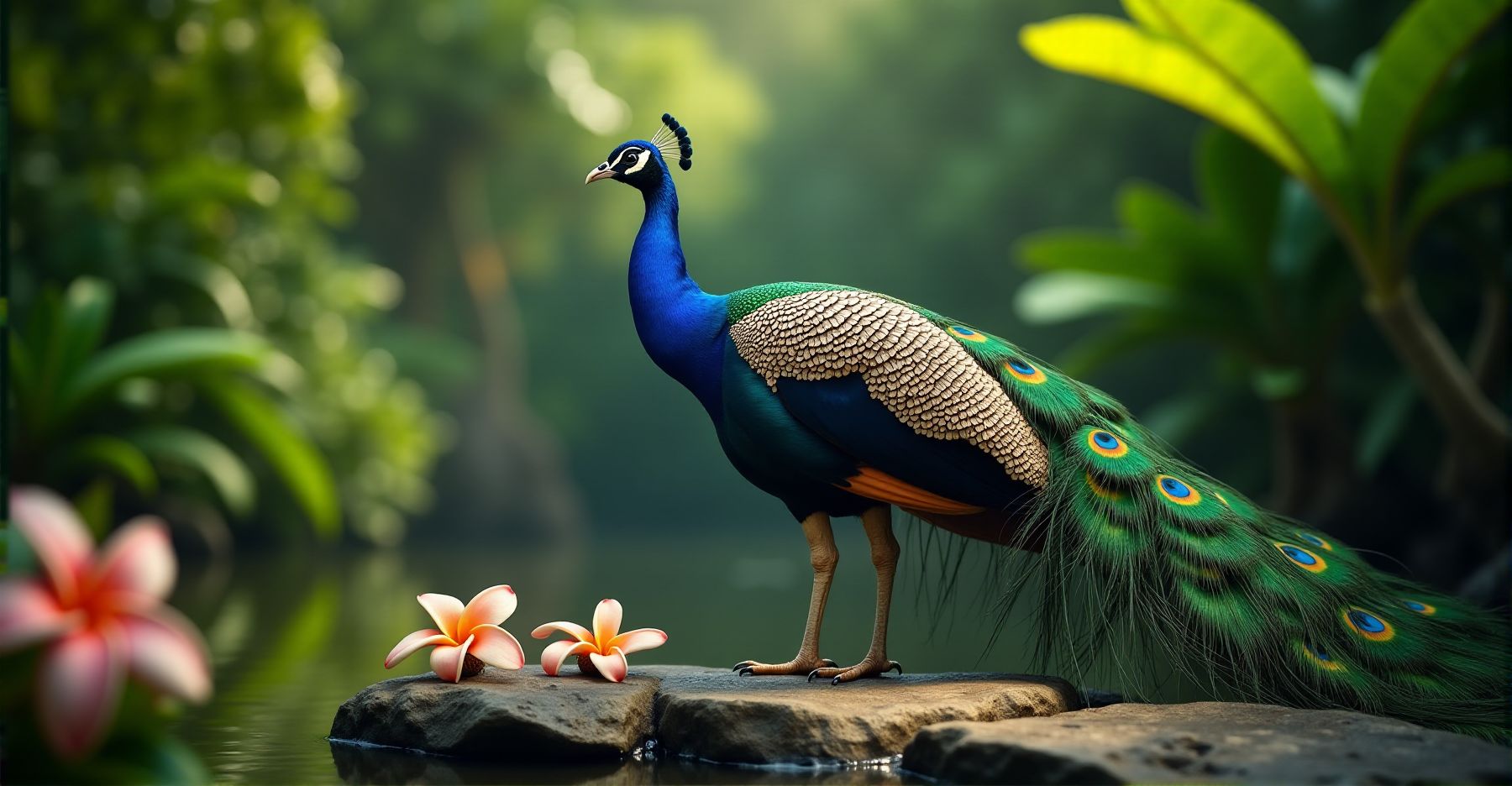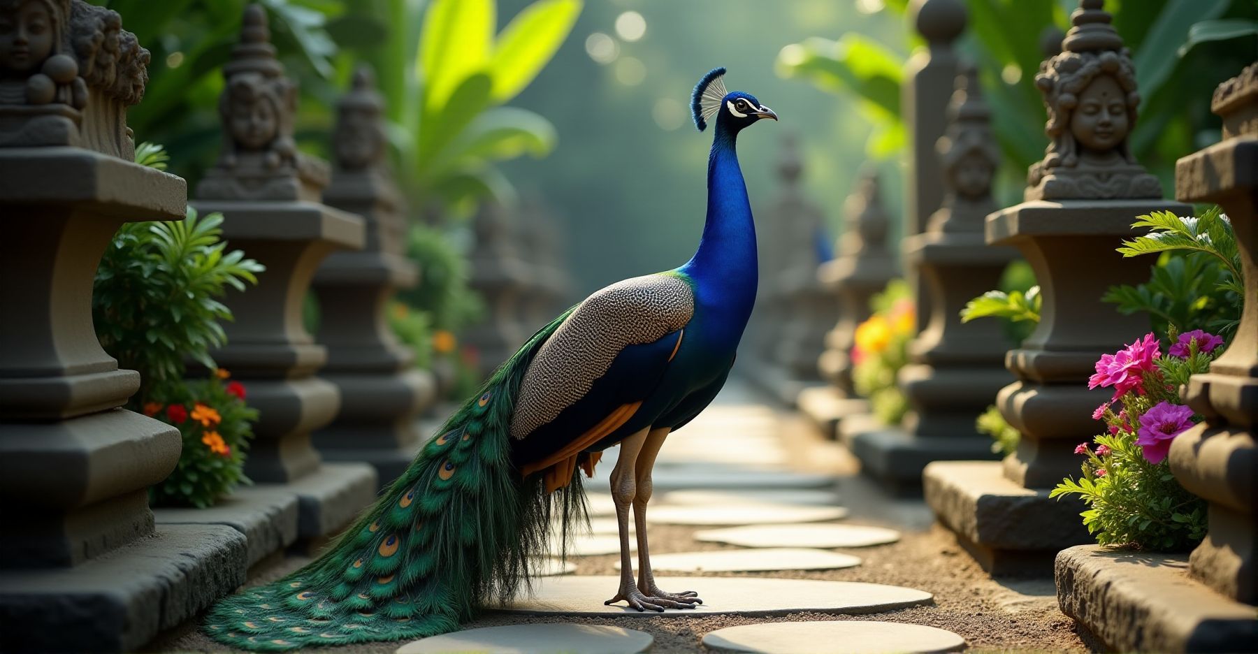 In oude Balinese teksten verwijst ‘Mayura’ naar koninklijke waardigheid. In het hindoeïsme is de pauw het rijdier van de god Kartikeya, wat moed en zuiverheid uitdrukt. Je ziet pauwmotieven terug in reliëfs op poorten, brugleuningen en plafondschilderingen.