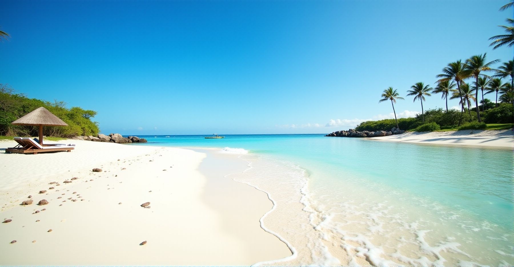 Als je hier aankomt, valt het meteen op: het water heeft allerlei tinten blauw, van licht turquoise vlakbij het strand tot diepblauw verderop. Het strand zelf is breed, soms wel vijftig meter, en het zand is fijn en wit. Dat komt vooral door de vele kleine stukjes koraal die tussen het zand liggen. Je loopt hier dus op een zachte ondergrond, zonder scherpe stenen of schelpen.