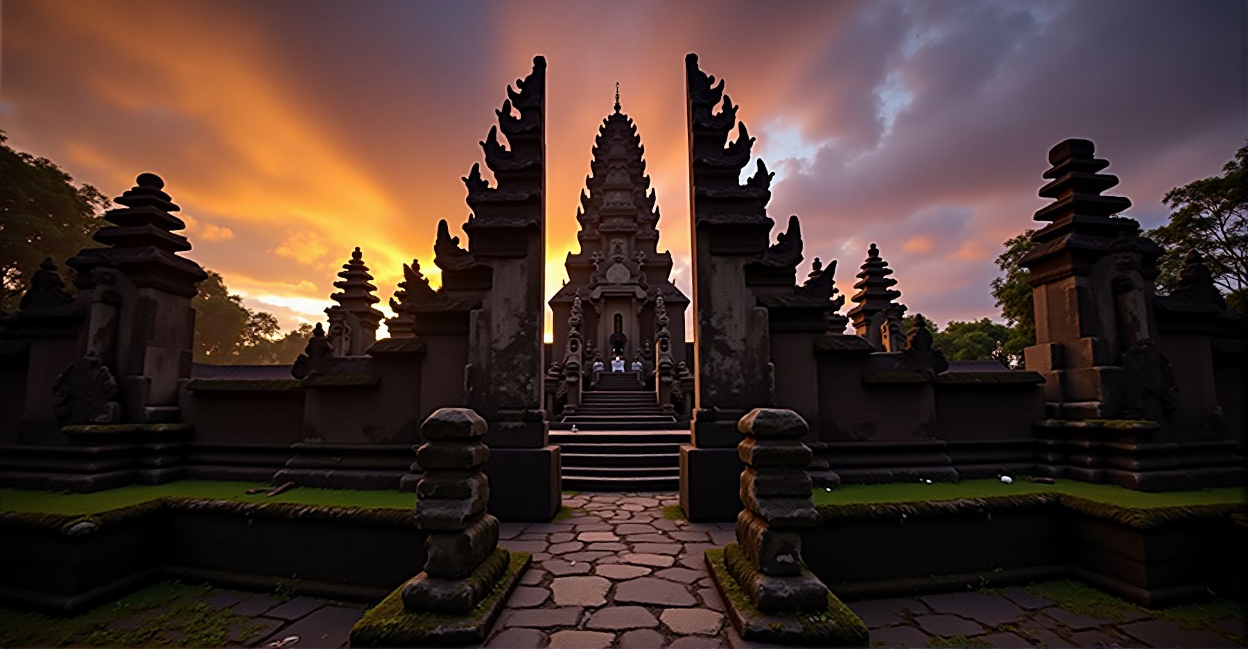 Als je het complex binnenloopt, ga je eerst door de candi bentar, gespleten poorten die de grens markeren tussen het gewone leven en het heilige gebied. Verderop staan paduraksa, overdekte poorten die naar de heiligste plekken leiden. Alle tempels zijn gericht op Gunung Agung, met de heiligste delen het dichtst bij de berg.
