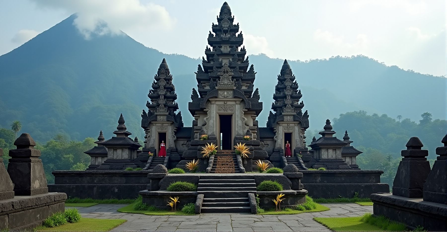 In het midden vind je de drie hoofdtempels voor Brahma, Vishnu en Shiva. Je herkent de meru-torens meteen aan hun oneven aantal daken. Die daken staan symbool voor de verbinding tussen hemel en aarde.